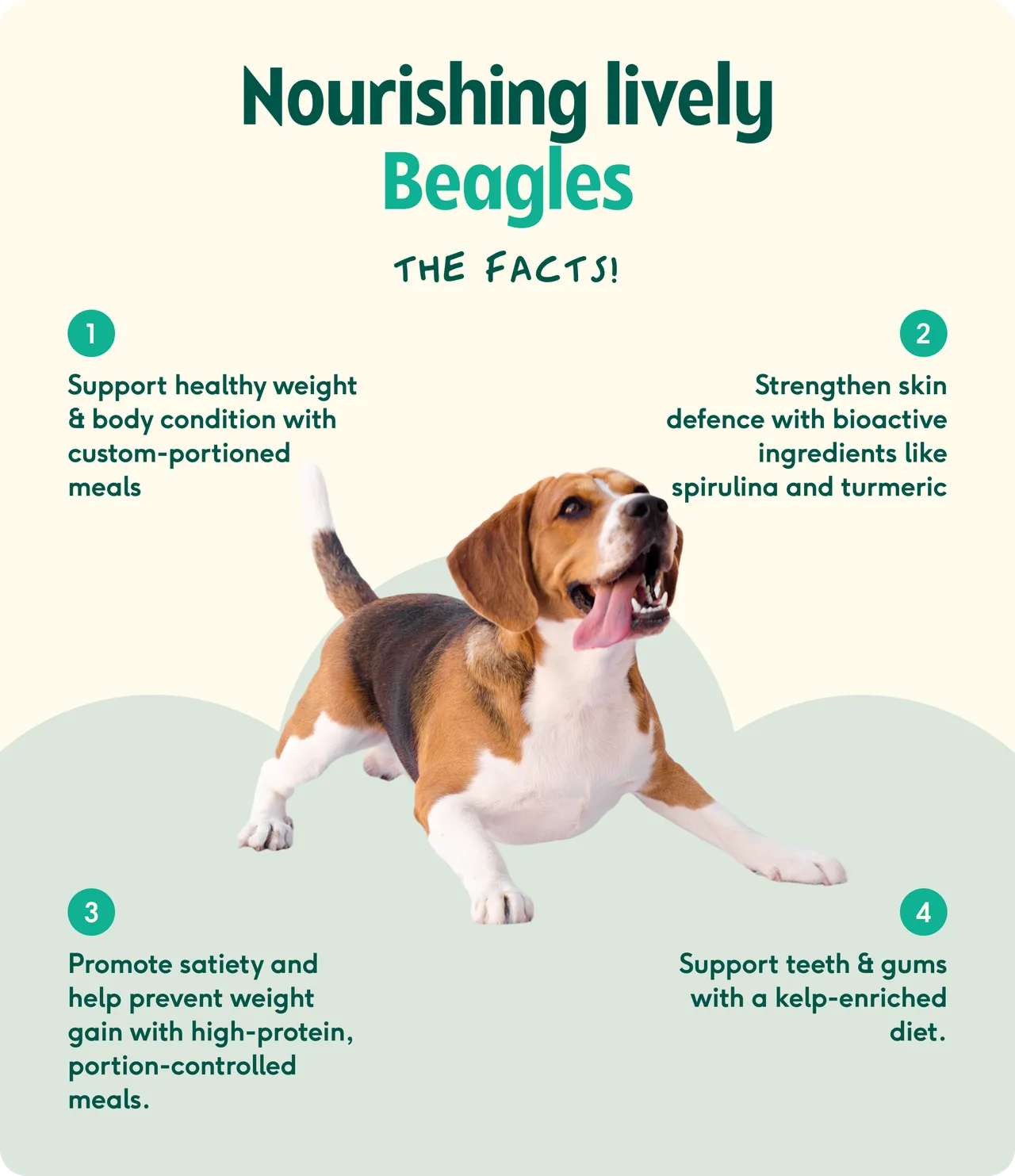 “Beagles are known to be food-driven with a good appetite, but this can make it easy for them to gain weight and become obese. Free-feeding is not advisable for this breed, which is why Lyka’s custom-portioned meals help to keep them nourished and full without risking over-feeding.”