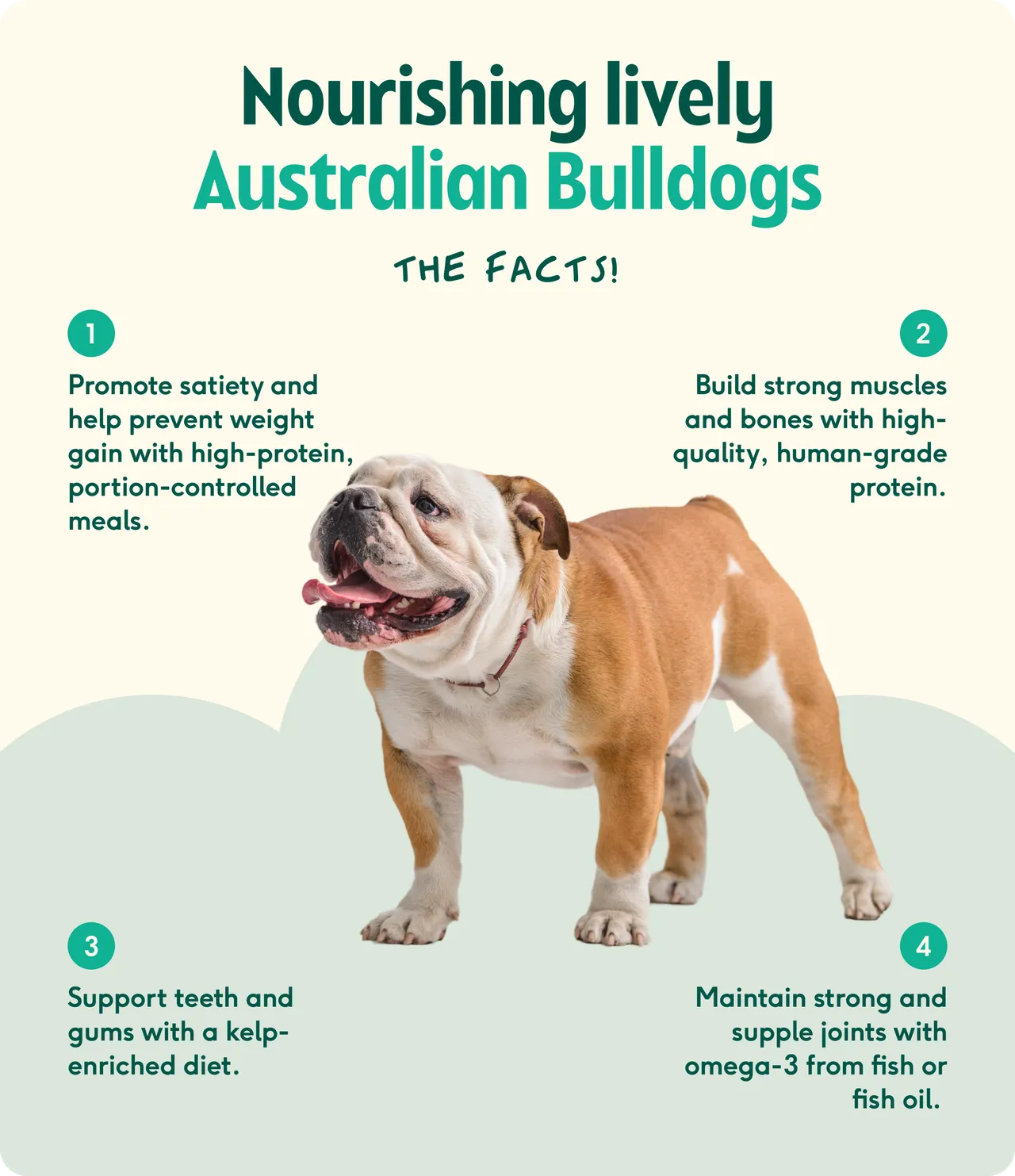 While generally healthy, Australian Bulldogs can be prone to joint conditions (elbow and hip dysplasia), obesity, and dental disease. A gently cooked, high-protein diet rich in omega-3 fatty acids supports their joints and overall wellbeing.