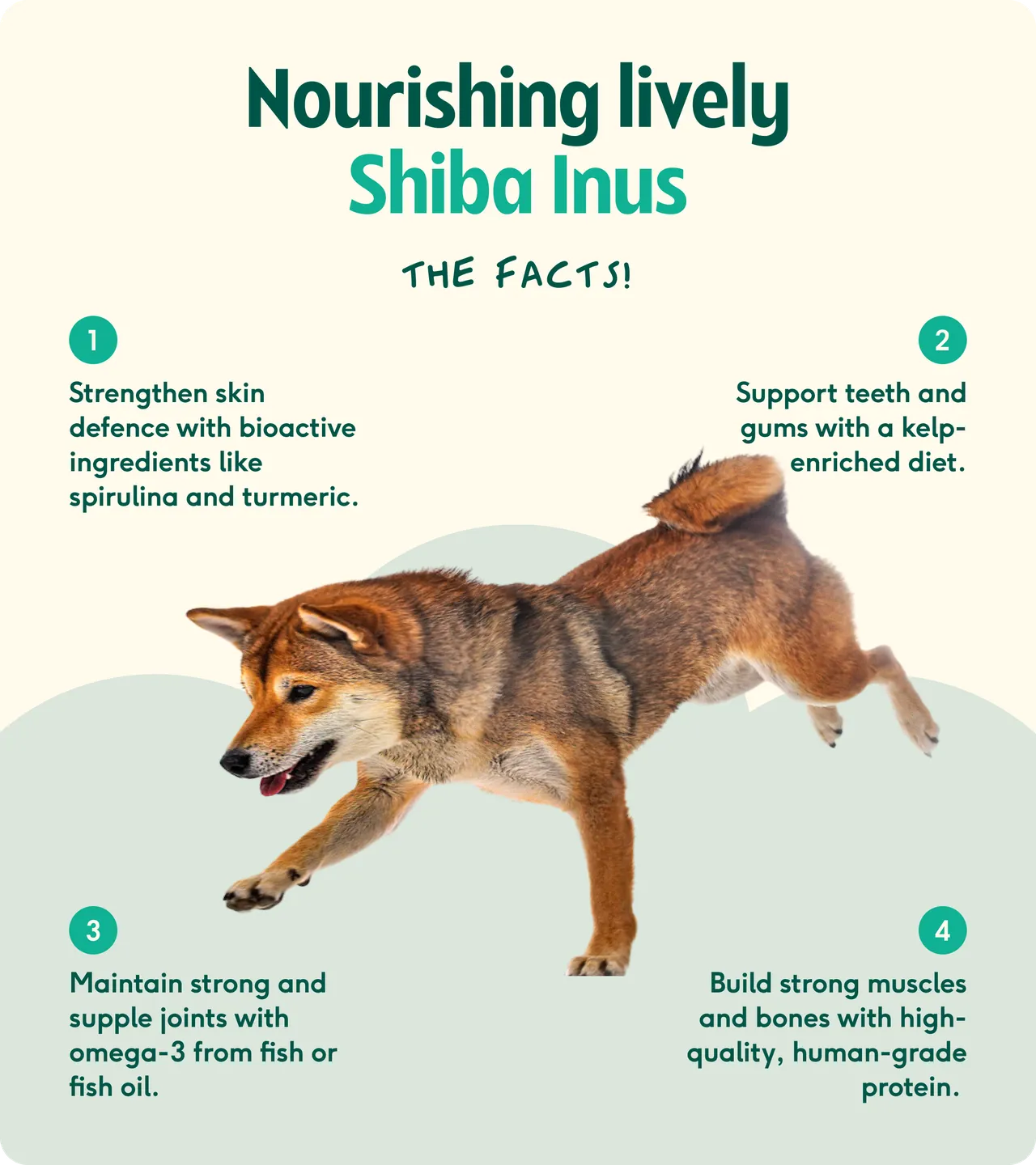Shiba Inu puppies need a diet containing high-quality protein for tissue growth, essential vitamins and minerals for bone development and brain function, and low GI carbohydrates for slow-release energy, like Lyka.
