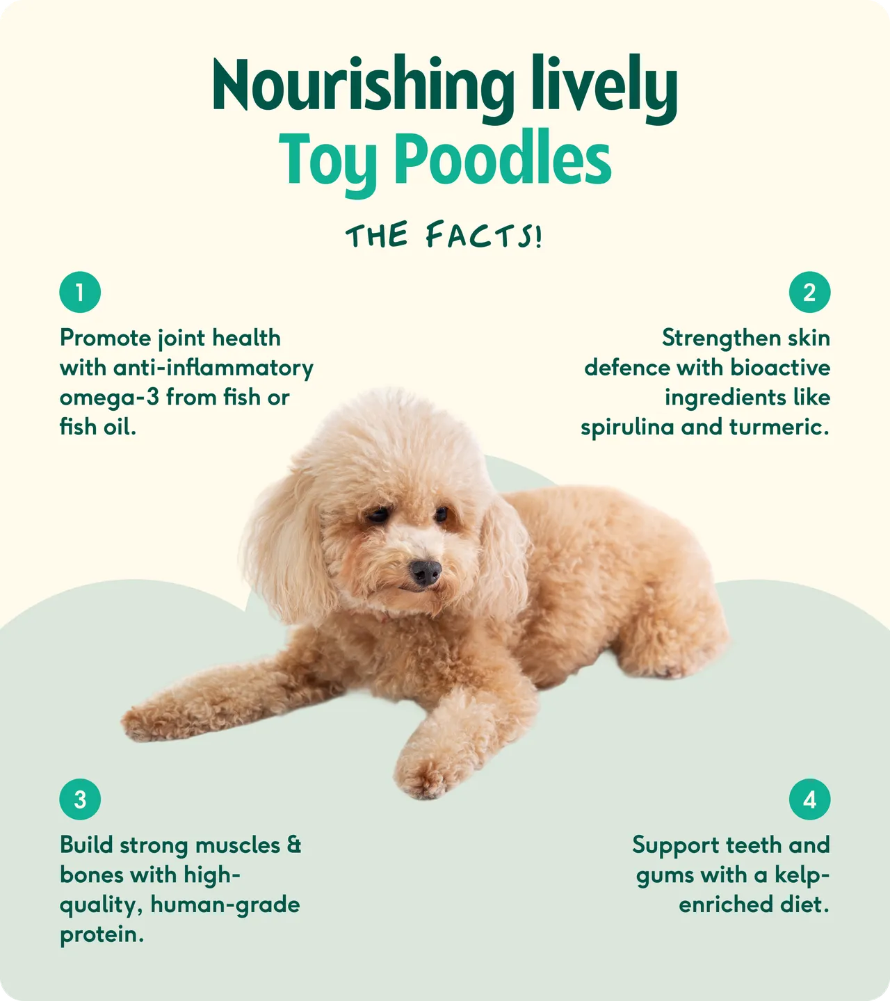Toy Poodles are generally a healthy breed, but they can be prone to skin and joint conditions, and heart-related problems. A gently cooked, high-protein diet rich in omega-3 fatty acids can support their skin, joint, and overall health.