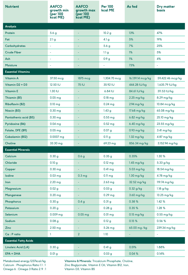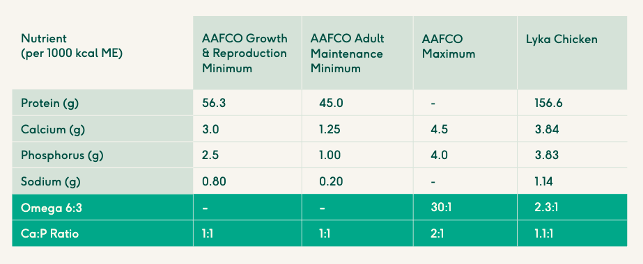 Nutritional information is available in the table below. More information, including a full ingredient list is available here or in the Lyka Veterinary Technical Information guide.