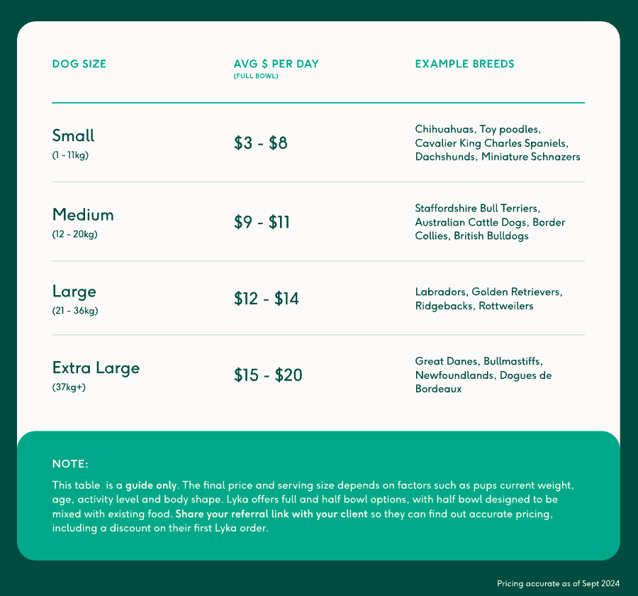 - Half Bowl: 50% of a dog's daily nutritional needs, supplemented by another food of choice. You can find more information about what we suggest your clients feed alongside their Half Bowl of Lyka here.